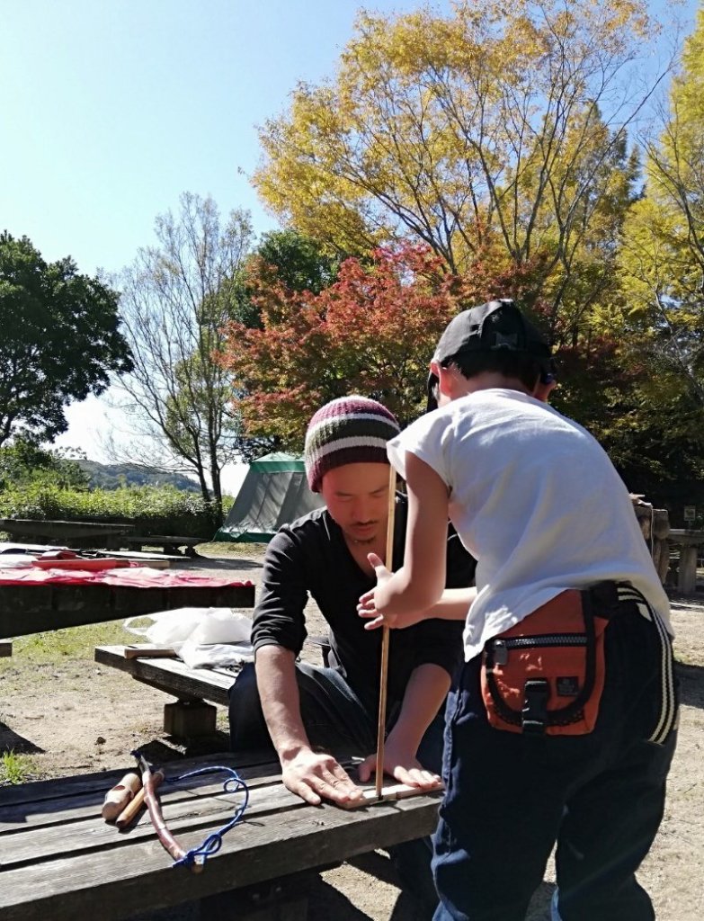 木と木をこすり合わせて自分の手で火を起こす楽しさを、初歩の初歩から体験します。